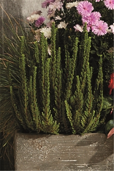 Schönheit, die zypressenartig in die Höhe wächst. Sie gedeiht sowohl in der Sonne als auch im Halbschatten und in Kombination mit anderen Herbstblühern kommt ihre besondere Wuchsform eindrucksvoll zur Geltung.
