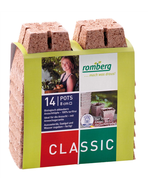 Romberg Anzuchttöpfe sind 100% torffrei und aus Zellulose hergestellt. Sie eigenen sich insbesondere für den Einsatz in Zimmergewächshäusern. Die Töpfe ermöglichen eine leichte Durchwurzelung. Es entsteht kein Umpflanzschock, da die Jungpflanzen mit dem Topf ausgepflanzt werden. Nach dem Auspflanzen zersetzt sich der Anzuchttopf biologisch.