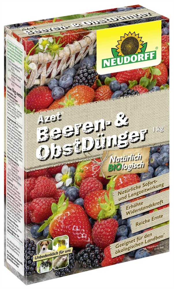 Organischer NPK - Dünger 7-3-10. Die natürlich BIOlogische Vollwertkost für Beerensträucher, Erdbeeren, Wein, Obststräucher und -bäume. Mit natürlicher Sofort- und Langzeitwirkung. Zusätzlich angereichert mit Mykorrhiza und Mikroogranismen für erhöhte Widerstandskraft. Sorgt für kräftige Fruchtbildung und steigert Ertrag, Reife und Wohlgeschmack. Aus natürlichen Rohstoffen. Unbedenklich für Haustiere, Bienen und Nützlinge