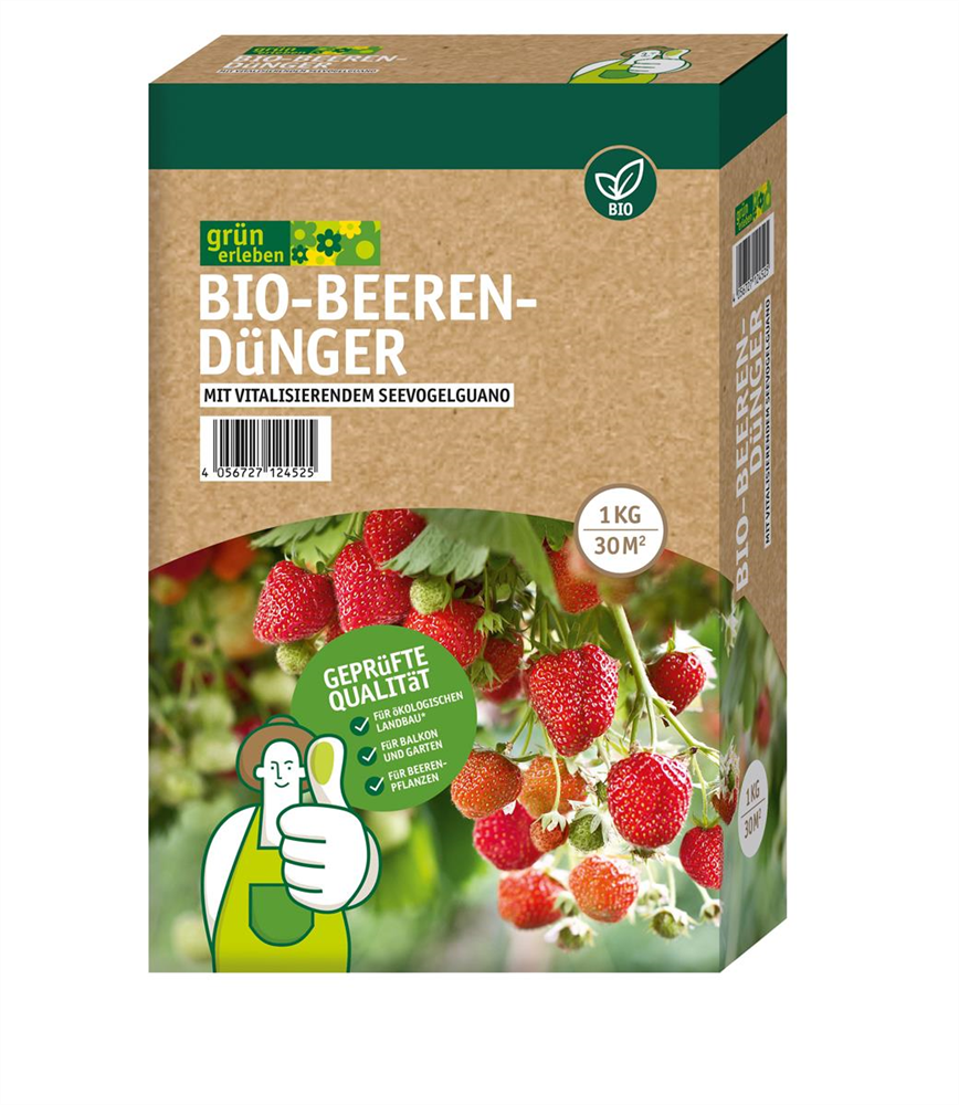 Grün erleben BIO-BEERENDüNGER ist ein gehaltvoller, organischer Spezialdünger, der auf die Bedürfnisse von Erdbeeren und Beerenobststräuchern abgestimmt ist. grün erleben BIO-BEERENDüNGER beinhaltet alle benötigten Nährstoffe für ein gesundes Wachstum und optimale Fruchtentwicklung. grün erleben BIO-BEERENDüNGER sorgt für einen üppigen Fruchtansatz und gesunde, haltbare Früchte.
