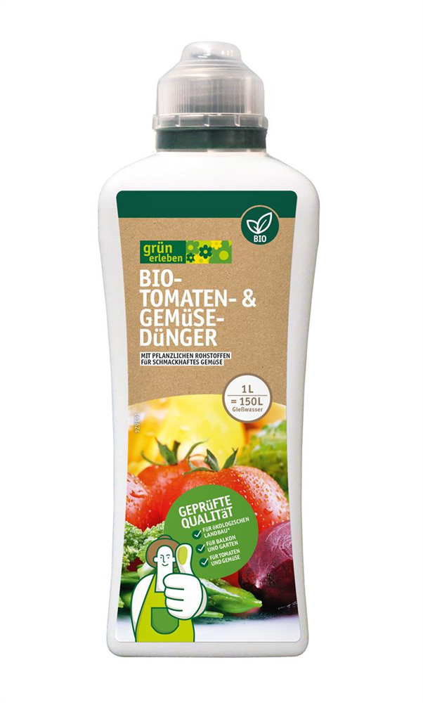 Grün erleben BIO-TOMATEN- & GEMüSEDüNGER ist ein Spezialflüssigdünger für Tomatenpflanzen und aller Art von Gemüse, der alle wichtigen Haupt- und Spurennährstoffe enthält. Die kalibetonte Nährstoffzusammensetzung sorgt für geschmackvolle Früchte, reichhaltigen Ertrag und ein gesundes Wachstum.