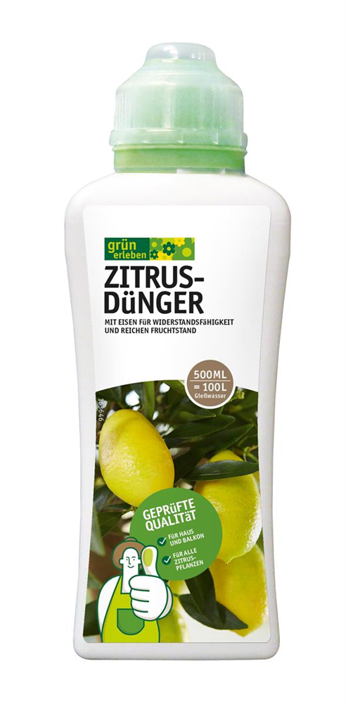 Grün erleben ZITRUSDüNGER ist ein hochwertiger, flüssiger Spezialdünger zur regelmäßigen Düngung aller Zitruspflanzen und mediterraner Pflanzen, wie Orangen-, Limonen- und Mandarinenbäumen. Durch die abgestimmte Zusammensetzung von Haupt- und Spurennährstoffen sorgt der grün erleben ZITRUSDüNGER für ein kräftiges und gesundes Wachstum, reichen Blüten- und Fruchtansatz und widerstandsfähige Pflanzen.