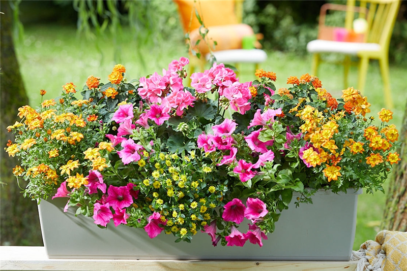 Die pinkfarbenen Blüten und der hängende Wuchs der großblütigen Petunie (Petunia-Hybride) sind ein knalliger Kontrast zu den strahlenden Blüten des Zweizahnes (Bidens ferulifilia). Zweizahn ist auch unter dem Namen Goldmarie bekannt. Der reiche Blütenteppich leuchtet golden von Mai bis Oktober und trotzt sogar lang anhaltenden Regenfällen. Er steht auch bei Bienen, Hummeln und Schmetterlingen hoch im Kurs. Das Husarenknöpfchen (Sanvitalia procumbens) hat neben den kräftig-grünen Blättern auch unzählige schöne, gelbe Blüten. Viele nützliche Bestäuber finden in ihnen eine reiche Nektar- und Pollenquelle. Die Stehende Geranie (Pelargonium zonale) in der Mitte des Kastens und neben ihr die Blütenbälle des Wandelröschens (Lantana camara) komplettieren diese fröhliche Kastenbepflanzung. Das Wandelröschen wechselt übrigens im Laufe des Sommers seine Blütenfarbe. Der Blumenkasten sollte regelmäßig gegossen werden. Achten Sie auf einen guten Wasserabzug.