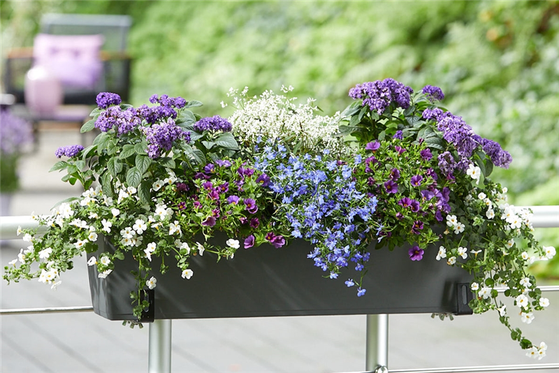 Im hinteren Bereich des Kastens hat die blaublühende Vanilleblume (Helitropium arborescens), die kompakt und aufrecht steht, einen guten Blick zu ihren Nachbarn. Leicht und luftig wirken die vielen schneeweißen kleinen Blüten des Zauberschnees (Euphor-bia hypericifolia). Mittig platziert unterstreicht er kontrastreich die duftenden, blauen Blüten der Vanilleblume. Im vorderen Teil des Kastens agieren harmonisch Männertreu (Lobelia richardii) und Zauberglöckchen (Calibrachoa). Eingerahmt werden sie rechts und links von der Schneeflockenblume (Chaenostoma cordatum). Diese Pflanze ist ein ech-ter kleiner Star. Kein Wunder, denn die vielen weißen Blüten, die wie Schnee mitten im Sommer wirken, sind auch bei Bienen und Hummeln sehr beliebt. Dieser Blumenkasten bevorzugt einen sonnigen bis halbschattigen Standort und freut sich über regelmäßige Wasserzugaben, Staunässe sollte vermieden werden.