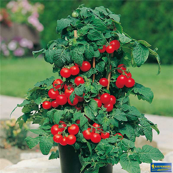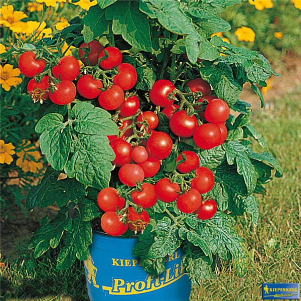 Die Zwerg-Tomate 'Primabell' wächst mit einer Höhe von ca. 30 cm außergewöhnlich kompakt. Sie bildet einen reichen Ansatz leuchtendroter, geschmackvoller Früchte mit ca. 2,5 cm Durchmesser. Ideal für den kleinen Gemüsegarten auf Balkon und Terrasse.