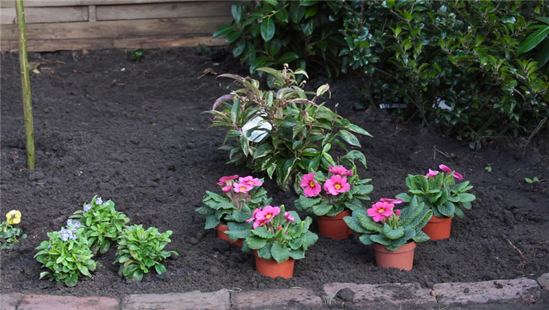 Gepflanzt werden Primeln an einem frostfreien Tag. Eine ungerade Anzahl von Pflanzen sieht am besten aus. Um das Arrangement vorab festzulegen, kann man die Blumen zunächst auf dem Beet verteilen.