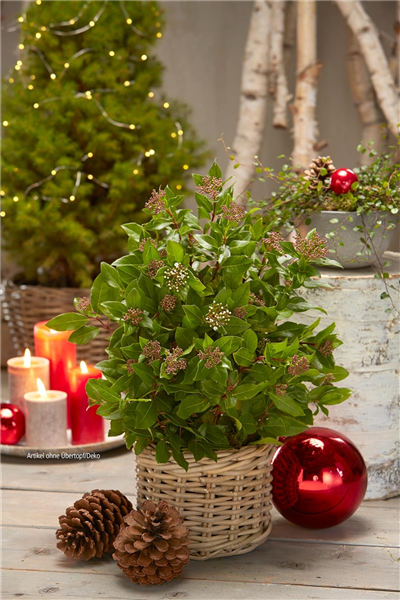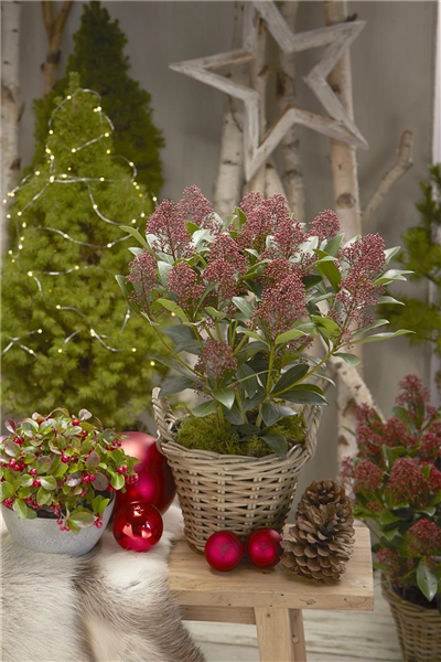 Die Blütenskimmie (Skimmia japonica) sorgt im Winter für Farbakzente im Garten, bringt im Frühjahr frisches Grün hinein und verwöhnt im Spätsommer mit duftenden Blüten. Geschützt an einem halbschattigen bis schattigen Standort vor der Tür, kann die Pflanze den ganzen Winter über draußen stehen. Übrigens gehört die Skimmie zur Familie der Rautengewächse, zu denen auch das Zitronenbäumchen gehört. Man kann die Verwandtschaft an den Blättern feststellen. Wenn man an diesen reibt, riecht man den Zitrusduft.