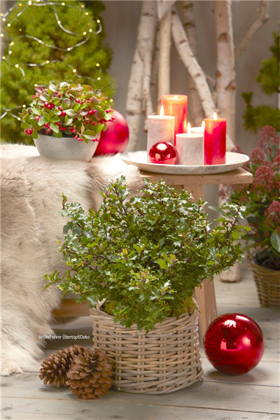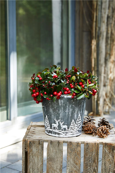 TIPP: Einen ganz besonderen winterlichen Charme erhält die Scheinbeere in einem Pflanztopf aus Metall. Der Pflanztopf mit seinem weihnachtlichen Motiv verstärkt die winterliche Stimmung eindrucksvoll.