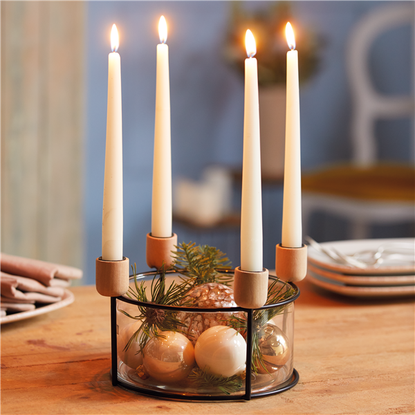 Der Kerzenhalter zum Stecken für vier Stumpfkerzen hilft jedem Bastelfreund. Sein schlichtes und dennoch modernes Design ist der perfekte Begleiter für Mono- und Mix-kränze und fügt sich in jede Wohnungseinrichtung spielend leicht ein.