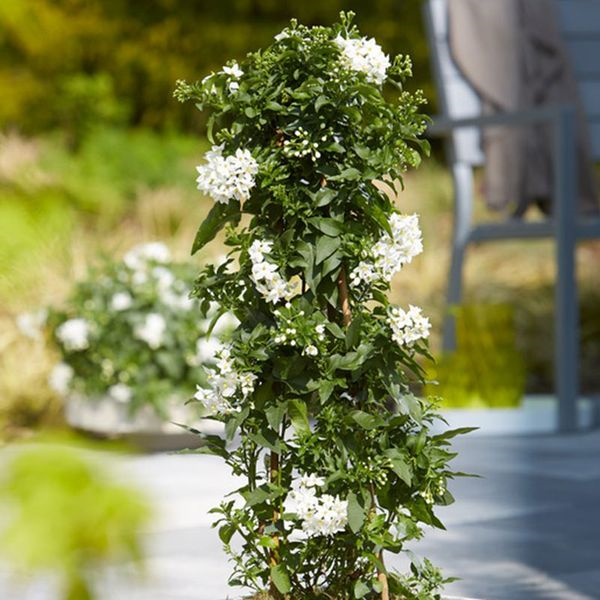 Der feine Jasmin (Solanum jasminoides) ergänzt jedes Balkon- oder Terrassenarrangement wunderbar. Im Nu zaubert er exotische Eleganz herbei. Das Tolle an ihm: Er blüht nicht nur schön, sondern duftet auch noch! Als Stämmchen oder als Pyramide wirkt der Jasmin besonders chic. Sonnig und windgeschützt gedeiht der Südamerikaner optimal. Achten Sie darauf, ihn regelmäßig zu düngen, denn er ist sehr hungrig nach Nährstoffen. Im Sommer 1 x pro Woche ist optimal. Dann wird er sehr schnell wachsen und Sie Ihrem kleinen Garten näher bringen.