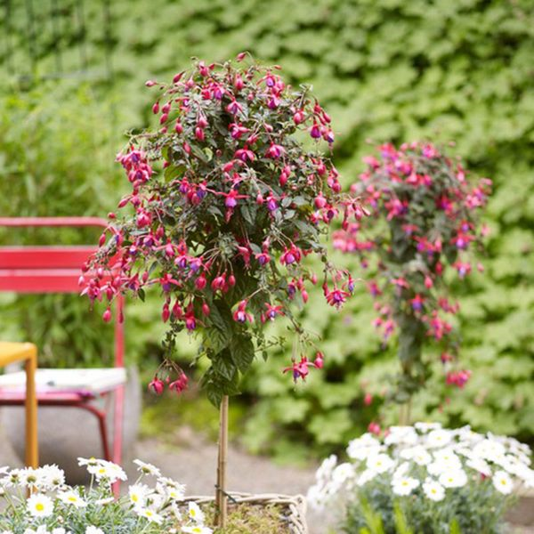 Ebenso bunt geht es mit der Fuchsie (Fuchsia-Hybride) zu. Die strahlend roten oder pinkfarbenen Blüten hängen wie kleine Glöckchen an den Zweigen. Am Stämmchen wirken sie besonders spannend. Aber auch als kleiner Strauch hat die Fuchsie ihren Reiz. Vor allem die schattigeren Seiten auf Balkon und Terrasse bringt die Pflanze zum Leuchten, denn sie braucht nicht viel Sonne. Achten Sie besonders darauf, immer ausreichend zu gießen. Aus ihrer Heimat in Mittel- und Südamerika ist sie nämlich viel Regen gewöhnt.