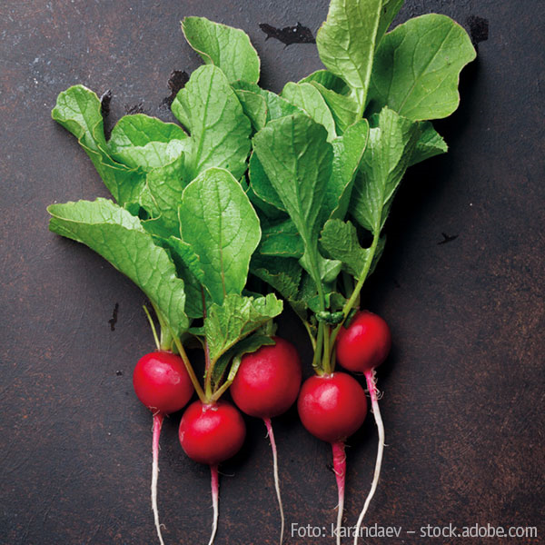 Aus der Rohkostküche sind Radieschen nicht wegzudenken. Sie verleihen Gerichten, wie z.B. dem Kartoffelsalat, eine interessante, leicht scharfe Note. Dieses Gemüse enthält wertvolle Inhaltsstoffe wie Vitamin K, Vitamin C, Eisen sowie Senfölglycoside und Anthocyane. Radieschen unterstützen u.a. die Behandlung von Erkrankungen der Gallenblase, bekämpfen Bakterien und reinigen den Körper. Greifen Sie bei dieser Wunderwaffe ruhig öfter zu!