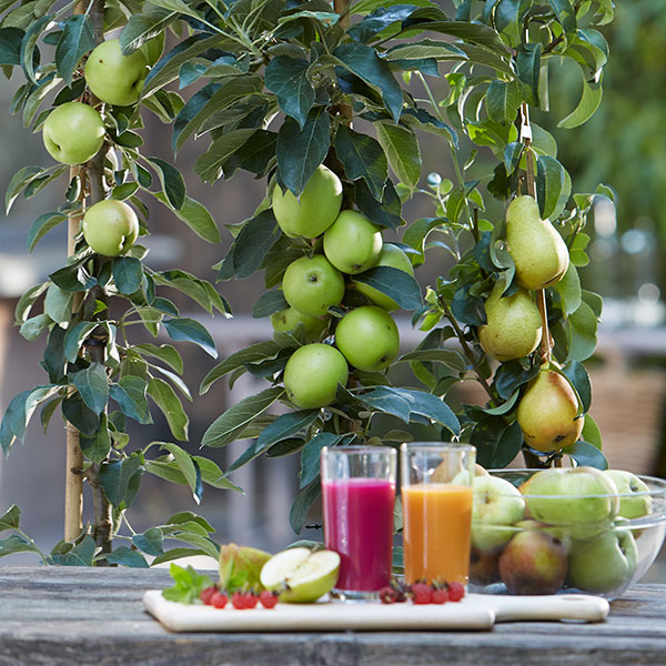 Mittlerweile können Sie durchaus Obstbäume im Kübel halten. Für den Balkon eignen sich speziell zwergwüchsige Sorten. Die meisten sind zudem selbstbefruchtend, so dass Sie von jeder Art nur ein Exemplar benötigen. Äpfel (Malus), Birnen (Pyrus), Süßkirschen (Prunus avium), Zwetschgen (Prunus domestica subsp. domestica) und Aprikosen (Prunus armeniaca) tragen leckere Früchte auf kleinstem Raum. Bei dem sogenannten Säulenobst wachsen Blüte und Frucht direkt am Stamm und ist somit platzsparend. In der Sonne ist für sie der ideale Standort, achten Sie dabei auf eine ausreichende Wasserversorgung. Bilden sich Seitentriebe, schneiden Sie diese am besten im Juni auf eine Länge von 10 cm zurück.