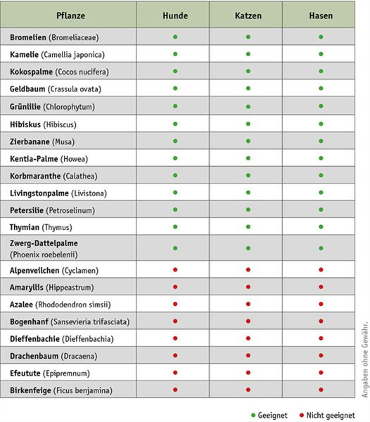 Übersicht von geeigneten und ungeeigneten Pflanzen für Tiere (Auszug):