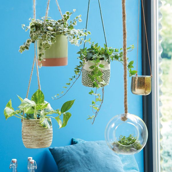 Alles Gute kommt von oben – das trifft auch auf den Efeu zu. Als Hängepflanze sorgt auch er für gute Luft. Als natürliche Klimaanlage filtert er die Raumluft und reguliert die Luftfeuchtigkeit für ein rundum angenehmes Raumklima. Sein Gattungsname „Hedera“ hat den Ursprung im Griechischen und lässt sich vom Wort „hedra“ für „sitzen“ ableiten, womit die Haftwurzeln des Efeus gemeint sind, die der Pflan-ze Halt geben. Der lateinische Name „helix“ bezieht sich auf seine windende Wachsform. Efeu bevorzugt einen hellen Standort ohne direkte Sonneneinstrahlung. Generell gilt die Regel: Je heller die Blätter des Efeus, desto heller kann die Pflanze stehen. Gießen Sie ihn regelmäßig und besprühen Sie das Laub ab und an mit lauwarmem, kalkarmem Wasser, da die Pflanze keine trockene Luft verträgt.