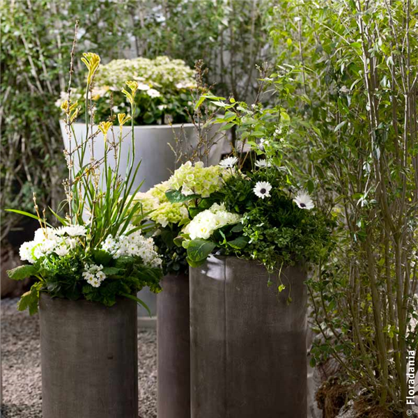Es geht darum, Stil und vorherrschende Farbe zu wählen – und dann dieser Wahl treu zu bleiben, sodass das Ergebnis nicht ein Sammelsurium einer bunten Farbmasse wird. Daher empfiehlt Karina Demuth, ein Farbthema in den Sparten Weiß, Rosa oder Blau auszuwählen, wo es eine riesige Menge Wahlmöglichkeiten gibt. Die Variation im Kübelgarten ergibt sich dann aus der verschiedenen Wuchshöhe.
