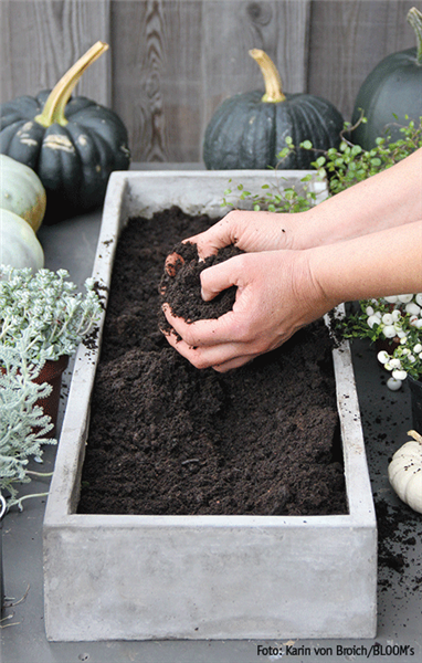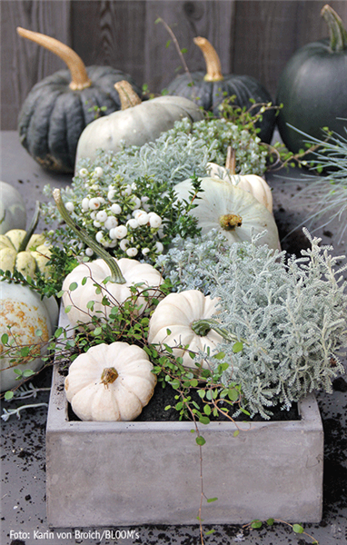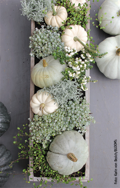 Menschen, die es modern mögen, oder Designästheten werden sicherlich die weiß-graue Deko-Variante des Kürbisses bevorzugen. Dazu einen schlichten Betonkasten zweidrittel mit Erde füllen, je eine Stacheldraht-, Mühlenbeckien-, Heiligenkraut-, Schneebeeren- und Chinesische Narrenkappenpflanze gegen­einander versetzt einsetzen und in die Zwischenräume sowie auch neben den Kasten einige weiße und gräuliche Kürbisse legen.
