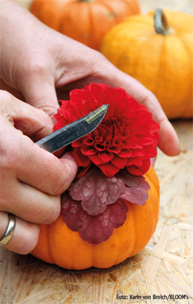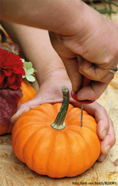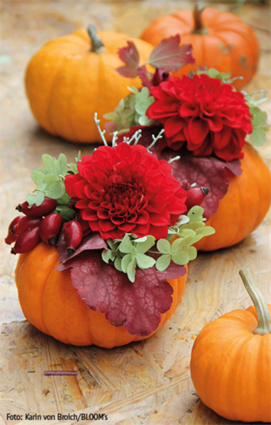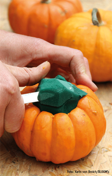 Oft werden diese von sich aus schon zierenden Kürbisse nur noch stilllebenartig mit anderen schönen Dingen kombiniert: Pflanzen, Blüten, Blättern, Früchten, Kerzen, Zweigen usw. Will man sie direkt mit Floralem dekorieren, muss der Kürbis ausgehöhlt werden. Dazu einen Deckel abschneiden, das Fruchtfleisch mit einem Schaber weitestgehend herauskratzen, gewässerten Blumensteckschaum, den es im Blumengeschäft oder Dekoladen gibt, hineinfügen, Überstehendes abschneiden und dann mit kurz geschnittenen Blüten, Blättern und Zweigen bestecken.