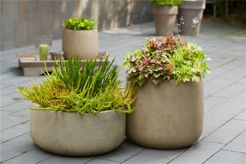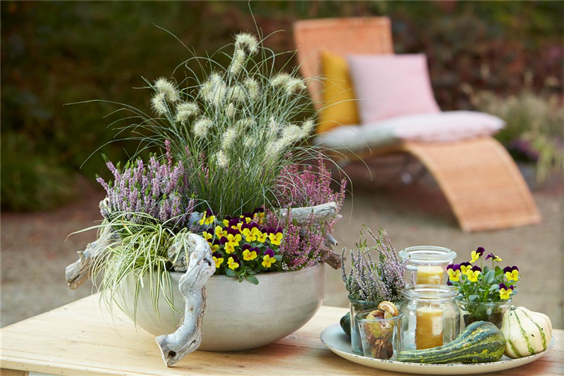 Steht der Herbst vor der Tür, freuen sich Kübel und Töpfe über eine neue Bepflanzung. Vor allem große Pflanzgefäße kommen prima zur Geltung und sind bis weit in den Winter attraktiv, wenn sie Ton in Ton mit Knospenheide in Begleitung von Blattschmuckpflanzen oder Gräsern bestückt werden. Coole Accessoires runden den modernen Look schließlich perfekt ab.