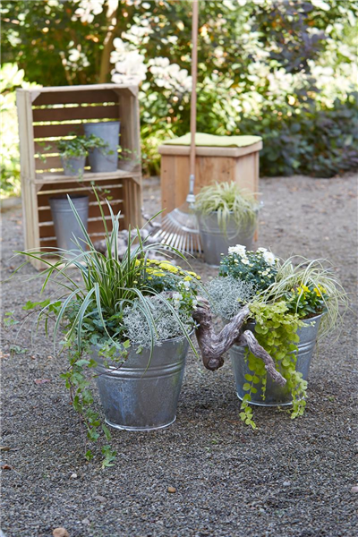 Für einen deszent rustikalen Look bei der Dekoration rund um die Pflanzgefäße kommen am besten Fundstücke aus der Natur zum Einsatz: Kastanien, Eicheln oder Blätter sind Klassiker, doch wie wäre es mit urigen Ästen, die in die Bepflanzung integriert werden? Spielt die Form der Äste mit, können damit sogar zwei Pflanzgefäße elegant miteinander verbunden werden und so zu einem kleinen Kunstwerk avancieren. Auch Baumscheiben haben einen tollen rustikalen Charakter und sorgen für eine natürliche Atmosphäre, zum Beispiel als Untersetzer für Pflanzen und Gießkannen oder als stilvolles Tablett.