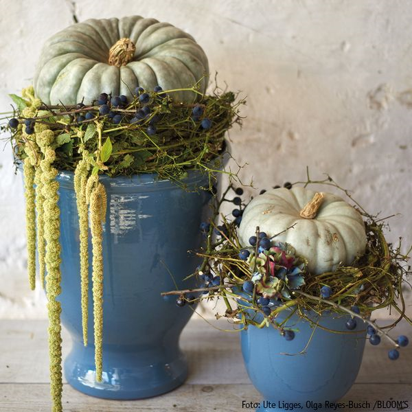 Entblätterte Hopfenranken sind zu Kränzen gewunden und dienen den dekorativen Kürbissen als Basis und Halt auf den schlanken Gefäßen.