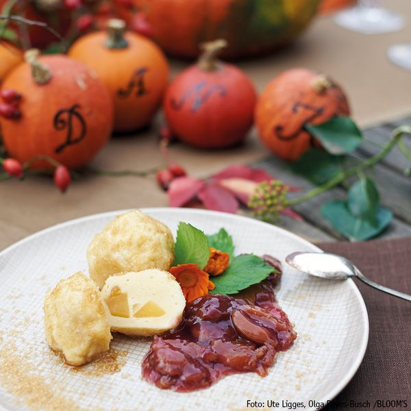 TOPFENKNöDEL gefüllt mit Kürbis an Zwetschgenkompott
