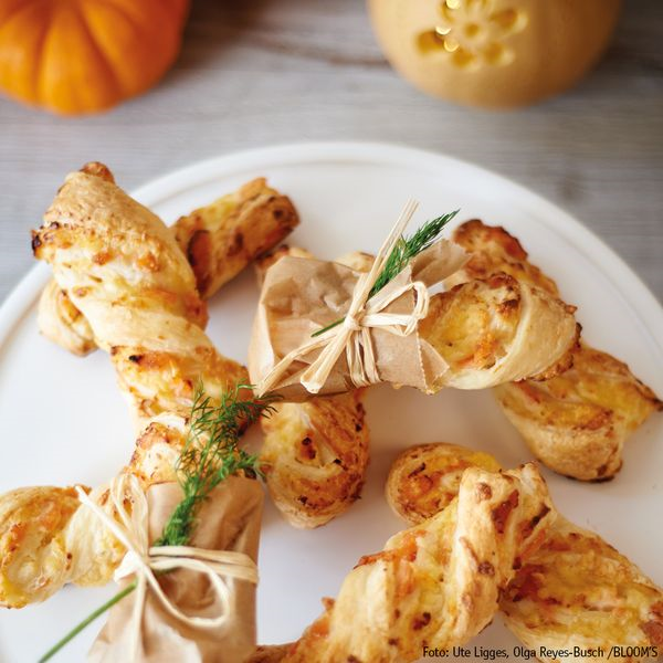 Blätterteig ausrollen, eine Hälfte mit ca. ¾ des Schmands bestreichen und ¾ des Lachses belegen. Dann Kürbisfleisch und Käse raspeln, würzen und ebenfalls ¾ der Menge darauf geben. Die nicht belegt Seite nun auf die belegte Seite des Teigs klappen. Jetzt wieder die Hälfte des Teigpakets mit jeweils dem Rest von Schmand, Lachs, Käse und Kürbisraspeln belegen. Danach wieder die unbelegte Teigseite über die belegte klappen und die Seiten leicht andrücken. Den Teig in zehn Streifen schneiden, jeden Streifen vorsichtig in sich verdrehen und auf ein mit Backpapier belegtes Blech legen. Die Stangen etwas mit Wasser bestreichen und bei 100 °C ca. 30 Minuten backen.