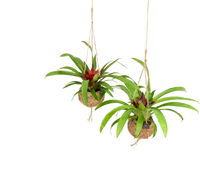 Der Kokodama Bromelie (Bromelia) eignet sich für einen hellen und warmen Standort, jedoch ohne direkte Sonneneinstrahlung. Bromelien sind südamerikanische Urwaldexoten, deren leuchtende Blüten mehrere Monate lang erstrahlen. Besprühen Sie die Bromelie leicht mit Wasser oder gießen Sie direkt in die Blattrosette.