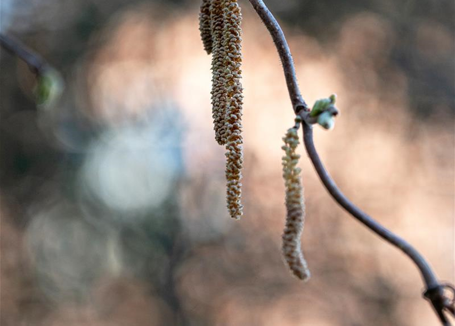 Die gelben Blüten der Korkenzieher-Haselnuss 'Twister' erscheinen in Kätzchen von März bis April.