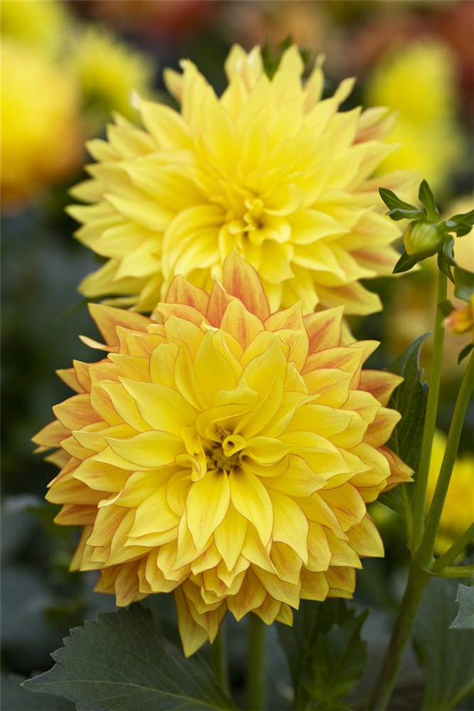 Die Dahlie 'XXL'® (Dahlia 'XXL'®) blüht über Monate hinweg. Je nach Sorte, erscheinen die dekorativen Blüten in den Farben Rot, Pink, Gelb und Rosa. Die dunkelgrünen, eiförmigen Blätter sind gezähnt. Bevorzugt wird ein sonniger Standort und eine durchlässige Erde.