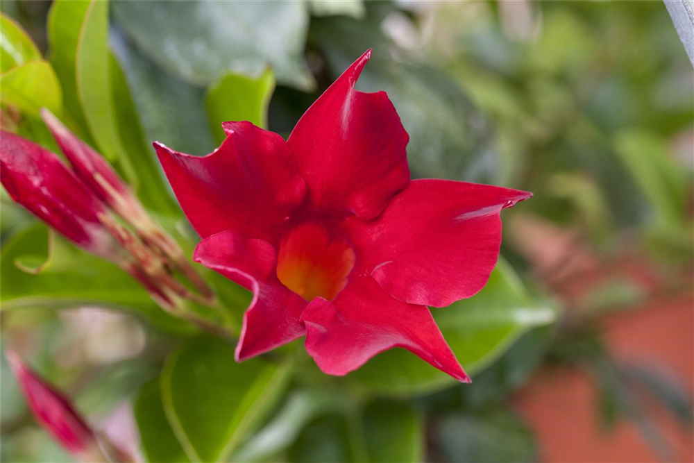 Die Dipladenia verzaubert durch ihre zahlreichen, roten Blüten, die von Juni bis September erscheinen.