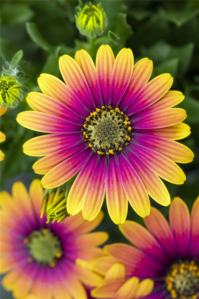 Osteospermum ecklonis 'Compact FlowerPower® Purple Sun' bildet während der gesamten Saison zahlreiche körbchenartige, orange-lilafarbene Blüten. Diese werden etwa 5 - 8 cm groß.