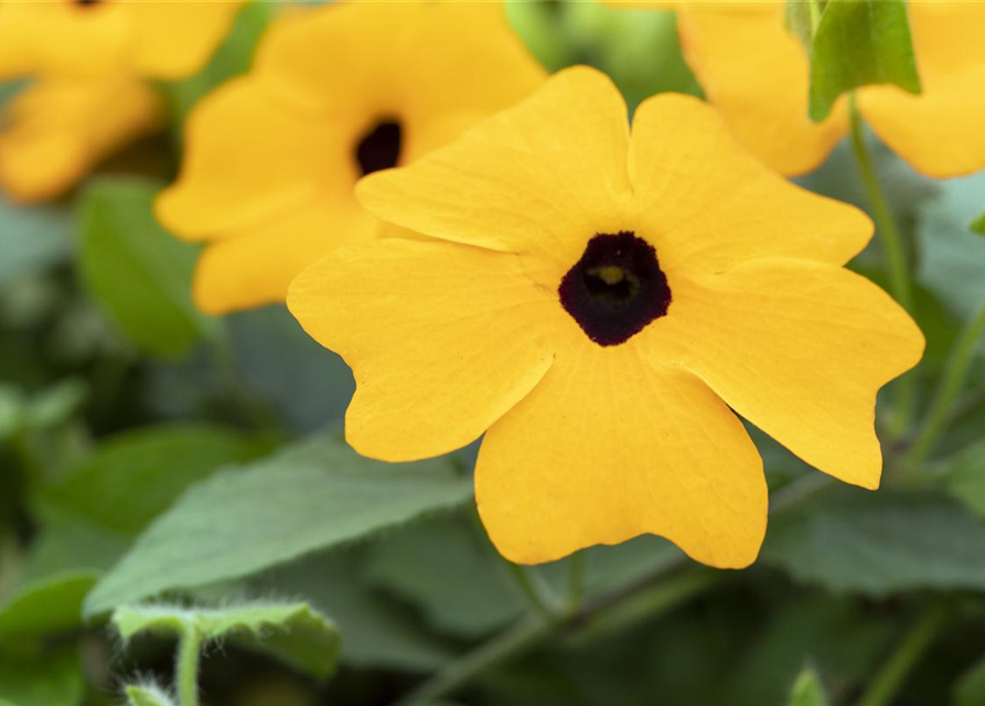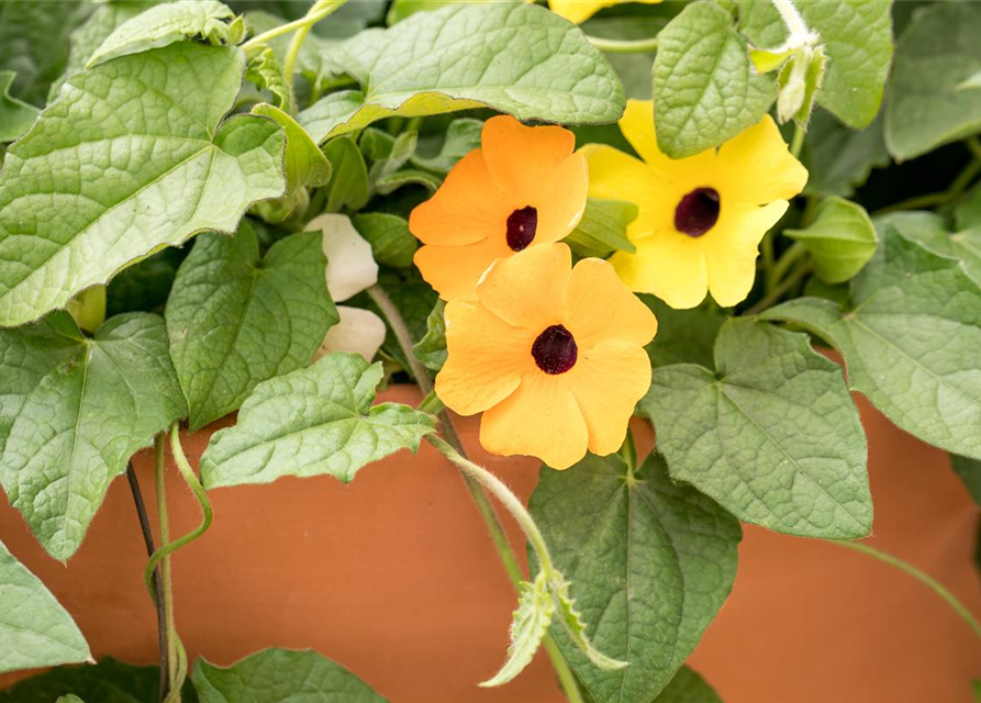 Thunbergia alata, goldgelb bildet während der gesamten Saison zahlreiche goldgelbe Blüten.