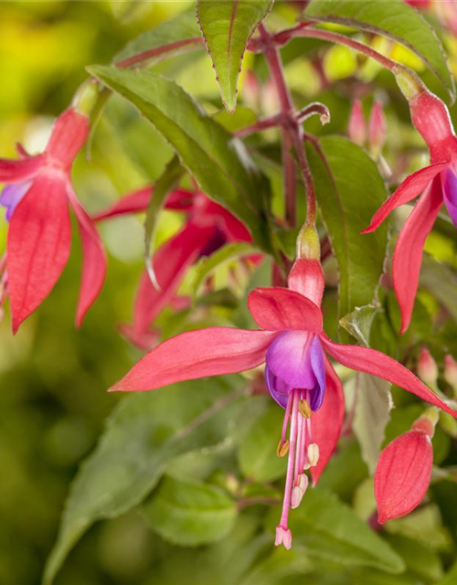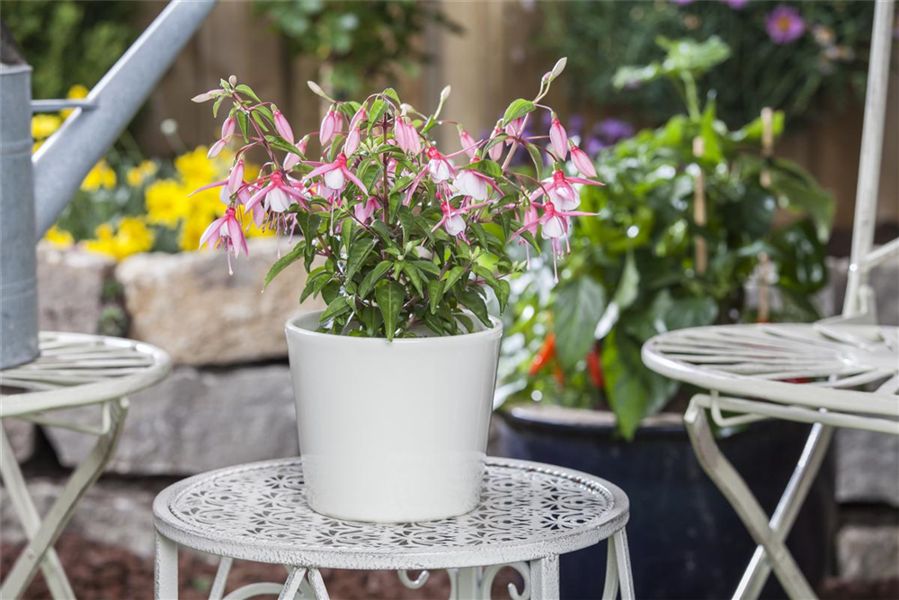 Die Stehende Fuchsie mit ihren glockenförmigen Blüten begeistert immer wieder. Sie ist eine der Terrassenpflanzen, an denen man sich nicht satt sehen kann. Ihre Größe variiert zwischen 80 und 150 Zentimeter. In einen Trog aus Naturstein gesetzt, verbreitet sie sofort eine idyllische Atmosphäre. Sie kann sonnig und halbschattig stehen. Einen humosen Boden möchte sie schon, hat aber sonst keine besonderen Ansprüche.