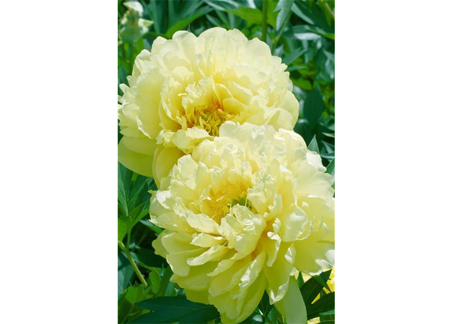 Paeonia itoh 'Bartzella' bildet halbgefüllte, schalenförmige, zitronengelbe Blüten ab Mai. Diese verströmen einen leichten Duft.