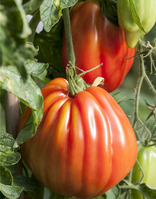 Die Fleischtomate 'Corazon F1' (Solanum lycopersicum) bildet Früchte, die aromatisch schmecken und bereits ab Juli geerntet werden können. Für das optimale Wachstum der Fleischtomate 'Corazon F1' werden ein sonniger Standort und durchlässiger, nährstoffreicher Boden benötigt.