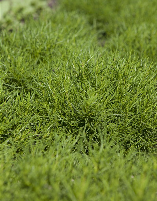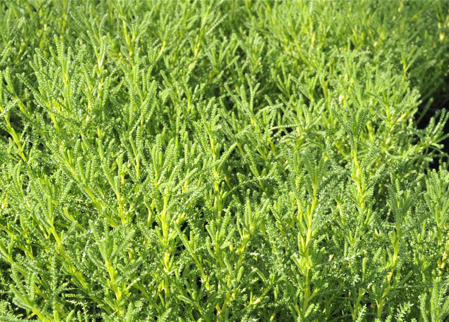 Santolina viridis bildet hellgelbe Blüten ab Juni.