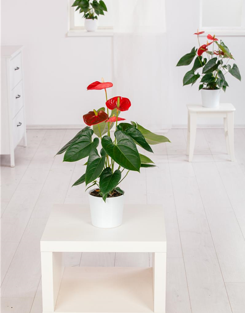 Die dunkelroten Blüten der Flamingoblume erscheinen in Kolben von Januar bis Dezember.
