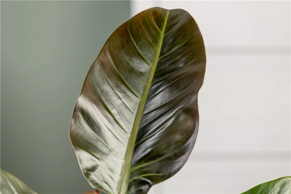 Die immergrünen Blätter des Philodendrons 'Imperial Red' sind grün-rot, herzförmig, glänzend.