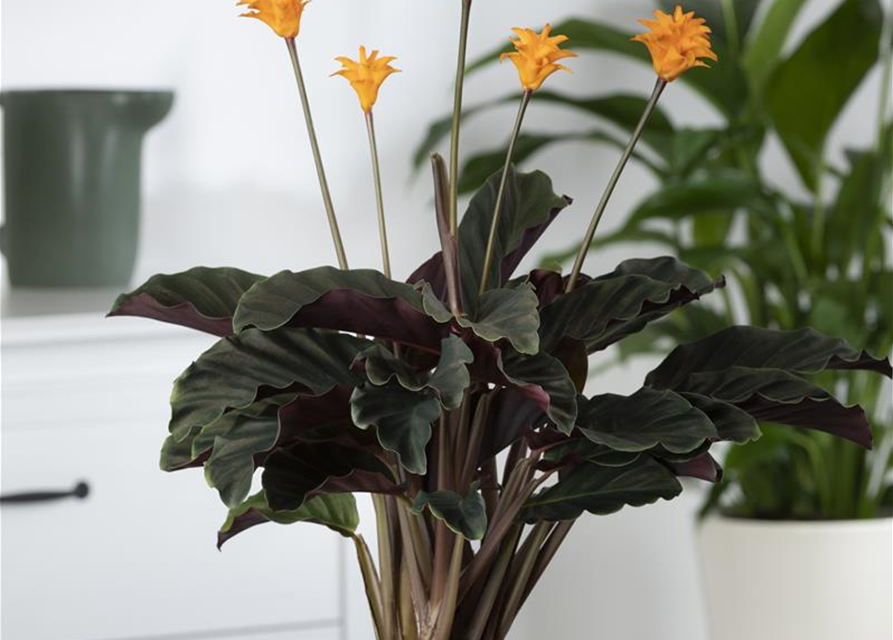 Die Korbmarante (Calathea crocata) ist eine Pflanze mit dekorativen, dunkelgrünen Blättern. Sie sind eiförmig und gewellt. Sie bringt von Januar bis Februar orangefarbene Blüten hervor. Bevorzugt wird ein halbschattiger Standort.